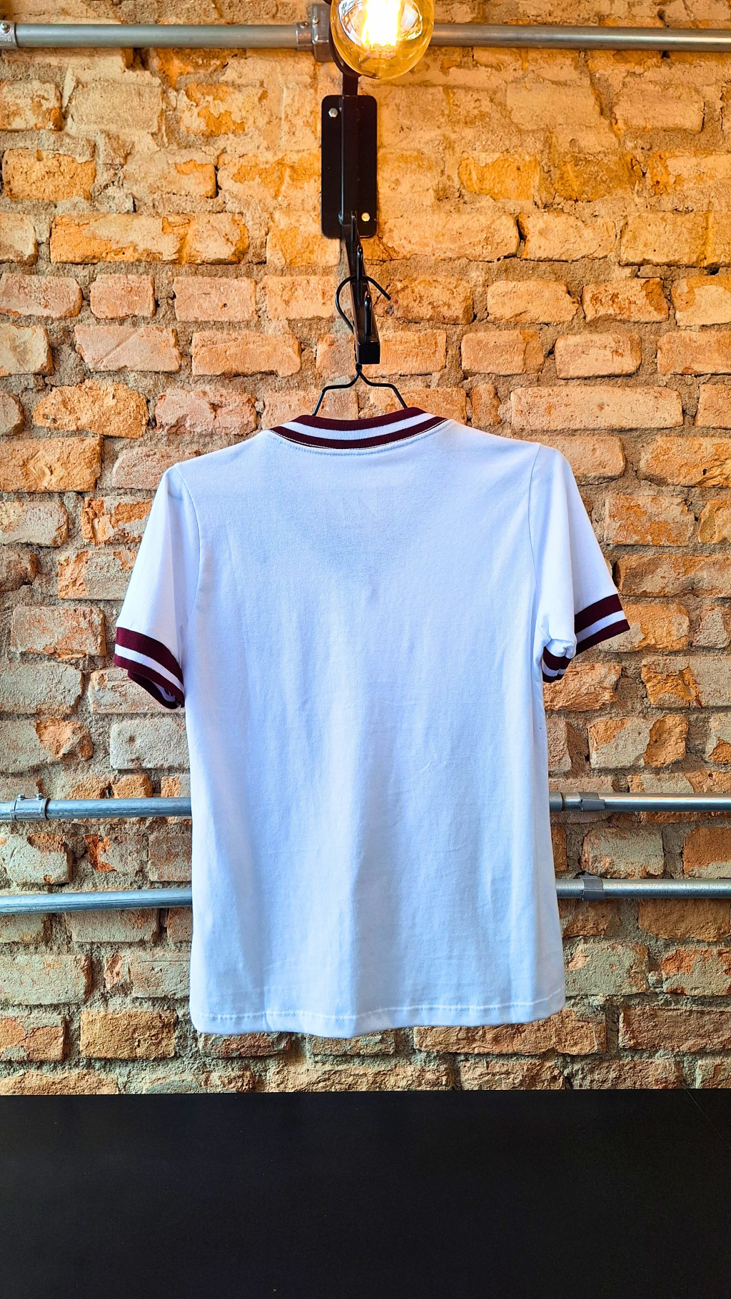Camiseta Anos 70 c/ escudo bordado, Branca Feminina, 100% algodão.